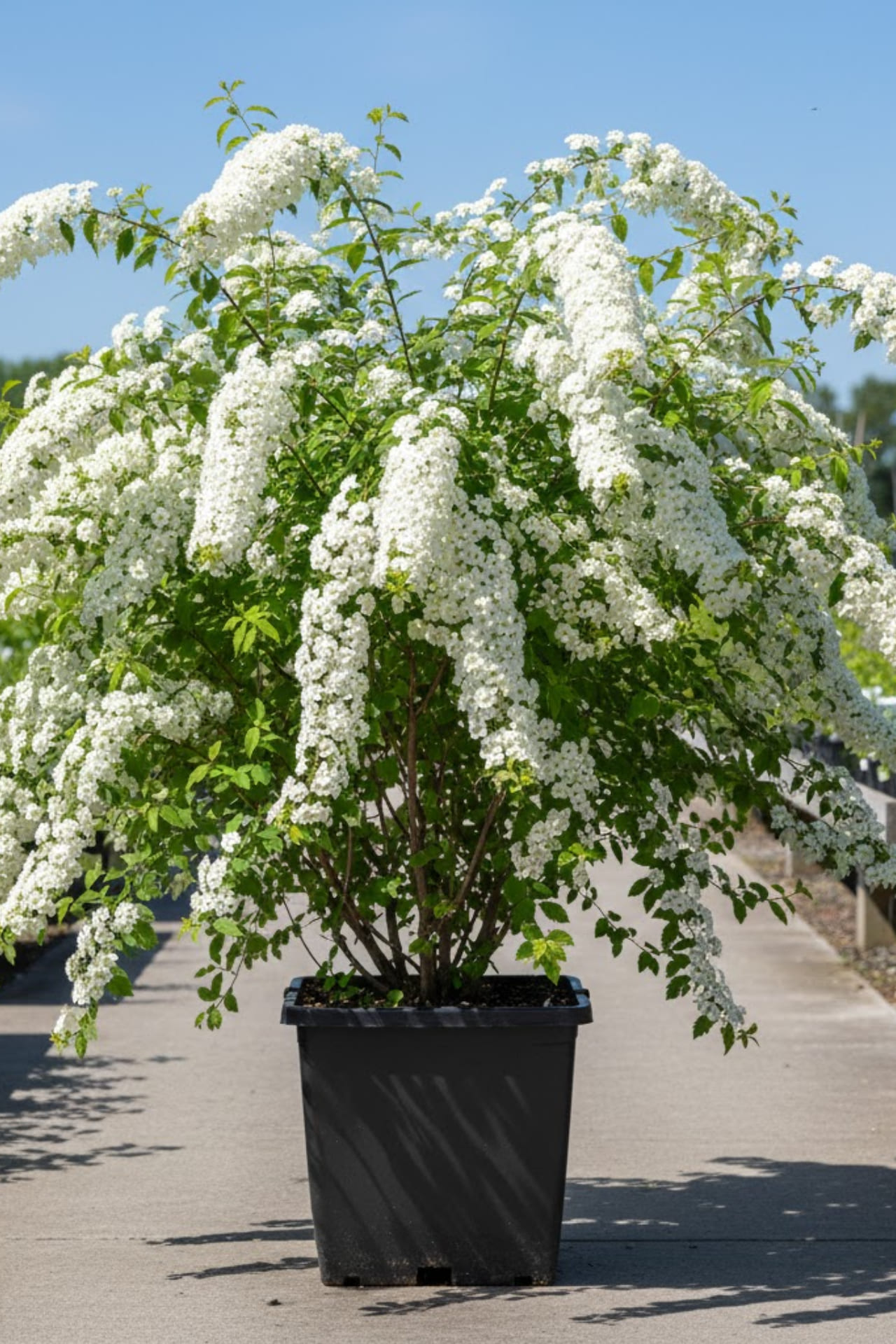 - Цветки чисто-белые, в густых, многочисленных, полушаровидных соцветиях, густо покрывающих весь побег. Цветет несколько недель, в мае
