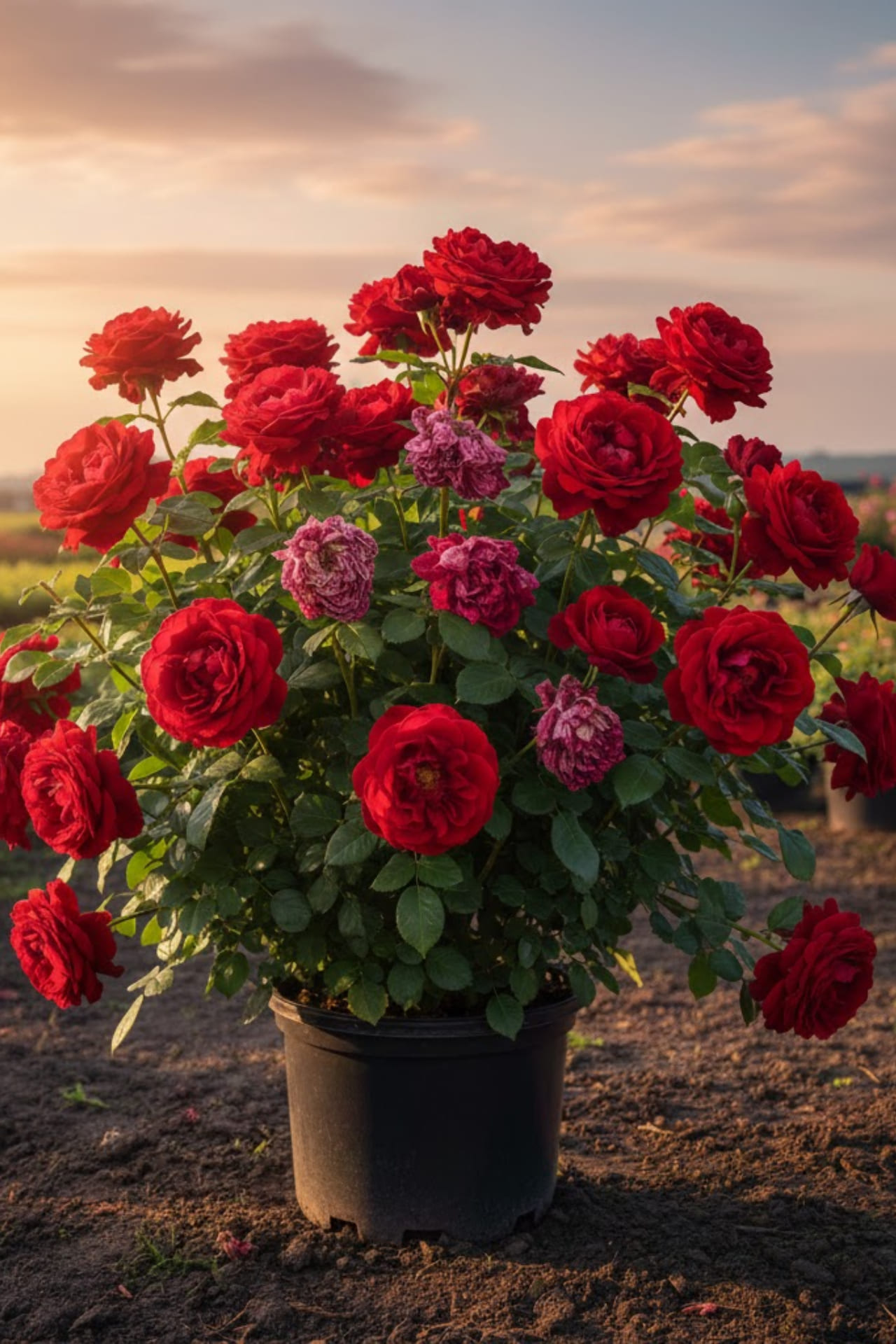 - Цветки красного цвета в форме бокала, около 35 лепестков