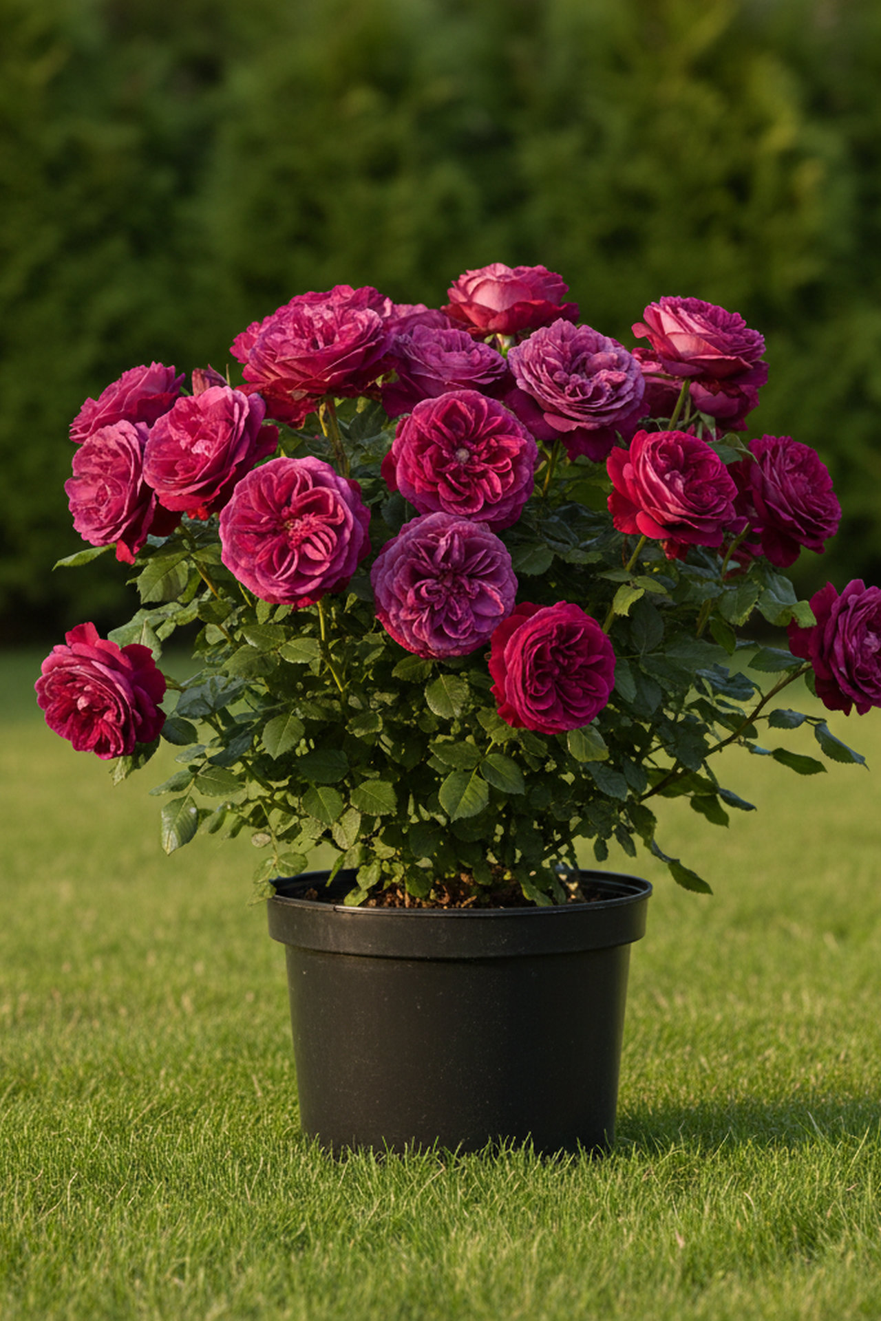 - бордово-красный до темно-фиолетового с красным оттенком, розетковидный до квадратного, густомахровый, 60 - 80 лепестков в одном цветке, диаметр цветка 8 - 10 см, обладает насыщенным ароматом с пряными нотками.
