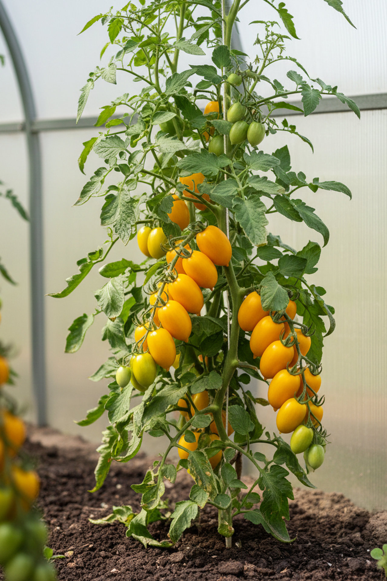 Высокоурожайный, индетерминантный, среднеспелый гибрид для защищенного грунта. Требует формирования и подвязки. Период от всходов до начала плодоношения 110-112 дней. Плод округлый, массой 40-50 г, ярко-желтый, блестящий, плотный. Мякоть плотная, сочная, кисло-сладкого вкуса. Кисть красивая, простая, плотная, с 9-13 плодами. Пригоден для уборки целыми кистями. Устойчив к ВТМ, фузариозному увяданию, очень пластичен, устойчив к перепаду температуры. Рекомендуется для потребления в свежем виде и цельноплодного консервирования.